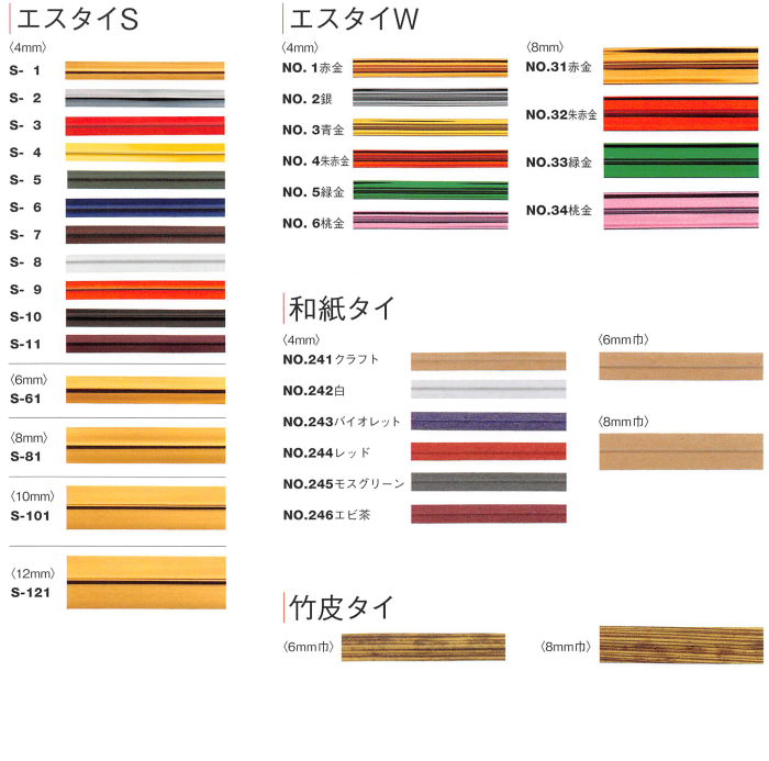 | 和紙タイ | 8㎜ | 12,15㎝ | 1,000本 | 200m, 1c/s=40巻 |