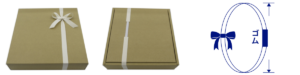 蝶結びでリボン掛けをしたその一部分をゴムにすることで誰でもカンタンに、「安定したカタチの蝶結びリボン」を箱などへ付けられます。