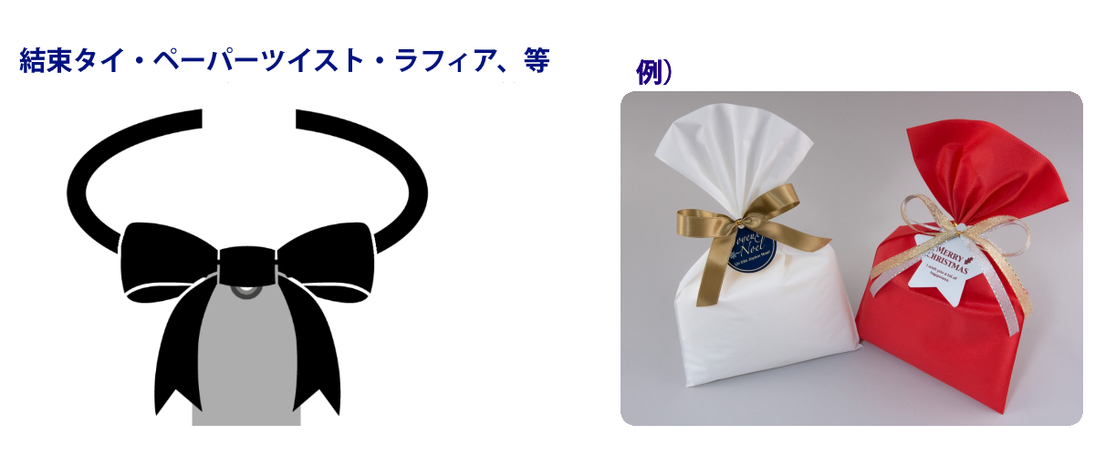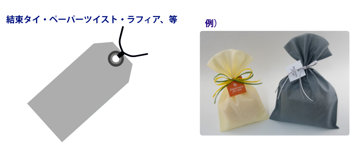 ペーパーツイストやワイヤー入りラフィアを付けることで袋への取り付けに便利です。